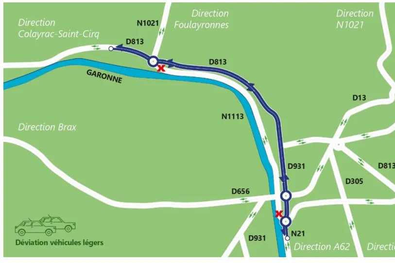 - Dans le sens Colayrac-Saint-Cirq vers Agen : RD 813 – RD 931 – RN 656 – RN 21