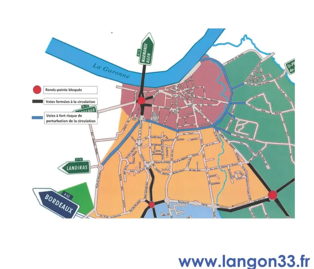Journée noire en perspective également à Langon, les agriculteurs, à l'appel du Collectif Viti 33, sont en train de bloquer des principales entrées de la ville à 5h30 : rond-point d’Aquitaine, rond-point du péage, rond-point de Roaillan et rond-point de la route de Bazas (au minimum).