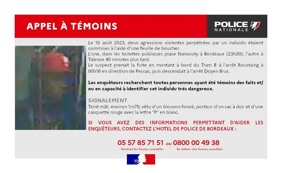 La Police nationale de la Gironde vient de publier un appel à témoins sur son compte X (ex-Twitter) après deux violentes agressions le 10 août 2023 au soir, commises par un individu à l'aide d'une feuille de boucher place Nansouty à Bordeaux à 23h30 et à Talence 40 minutes plus tard.