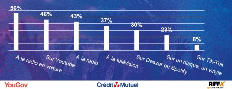 Un large public écoute la musique en radio dans la voiture (56%). C'est plus que sur les différentes plateformes numériques et physiques.