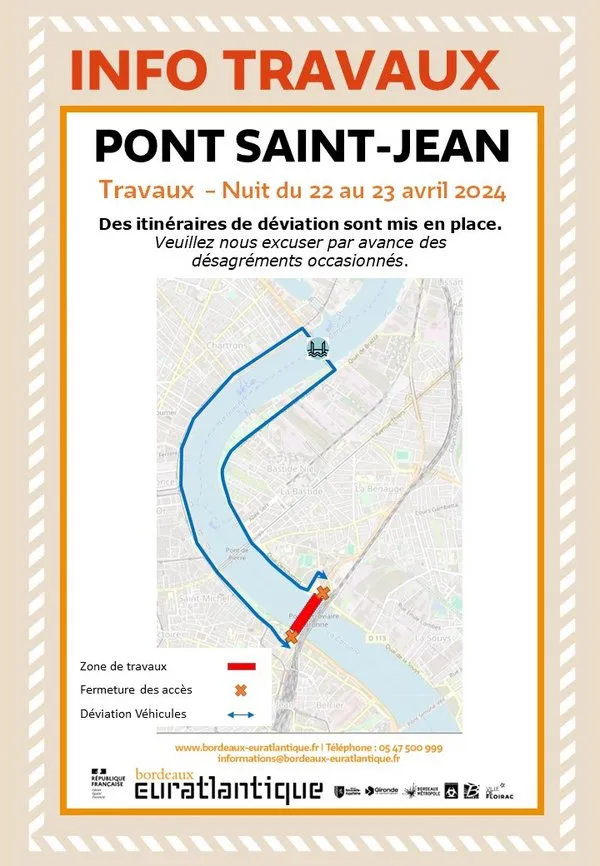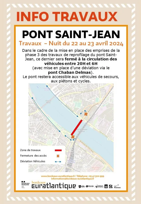 Le pont Saint-Jean sera fermé la nuit prochaine à Bordeaux en raison de travaux liés à la requalification de l’ouvrage. Fermeture entre 20h ce soir et 6h demain matin.