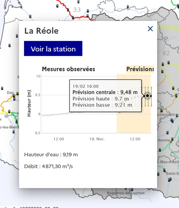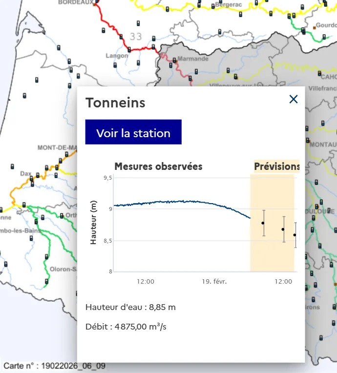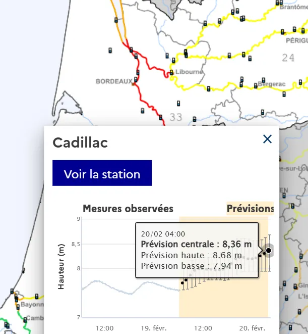 • Sur le tronçon Garonne girondine, en vigilance ROUGE, sur le secteur de La Réole une tendance à la hausse est constatée. Sur le secteur de Cadillac-sur-Garonne la situation est à la hausse pour les prochaines mers ;