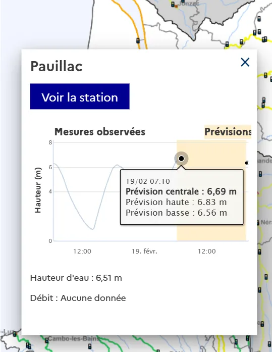 • Sur le tronçon Estuaire Gironde, en vigilance ORANGE, des débordements ont été constatés à la pleine mer de ce matin. Des débordements plus faibles sont attendus aux pleines mers suivantes, uniquement sur le secteur de Pauillac ;