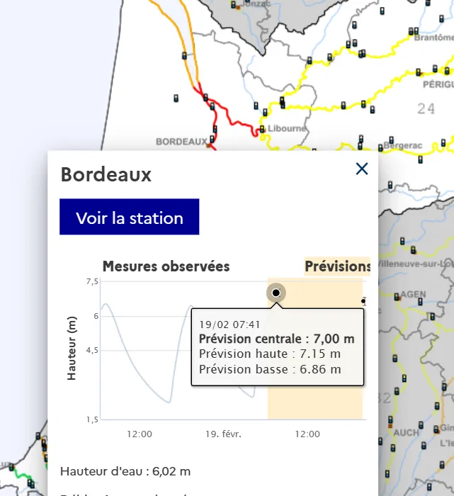 "En raison de la vigilance rouge aux crues, le maire de Bordeaux, Pierre Hurmic, a décidé d’activer, pour la première fois depuis 1999, le Plan Communal de Sauvegarde de la Ville pour le phénomène de crue, mercredi 18 février 2026. Le pic, dont le niveau maximal a oscillé entre celui constaté en 1999, lors de la tempête Martin, et en 2010 lors de la tempête Xinthia, a été atteint à 7h20 ce jeudi 19 février 2026. Le niveau d’eau s’est élevé à 5,04 mètres NGF et 6,85 mètres selon Vigicrue, 10 centimètres en dessous des estimations.