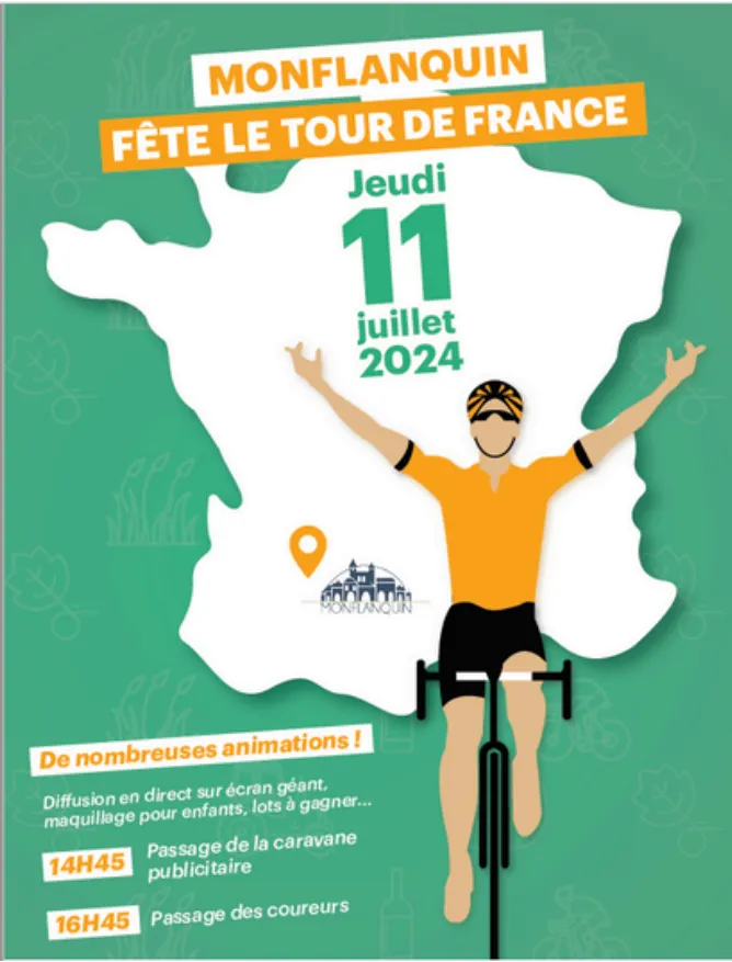 La commune de Monflanquin, les Jeunes Agriculteurs 47 et Groupama organisent une Fan Zone ouverte au grand public pour célébrer le passage du Tour de France le jeudi 11 Juillet 2024. Rendez-vous est donné à la population à partir de 11h avenue de la libération à Monflanquin pour profiter de l'ensemble des animations proposées gratuitement à tous les amateurs de vélo.