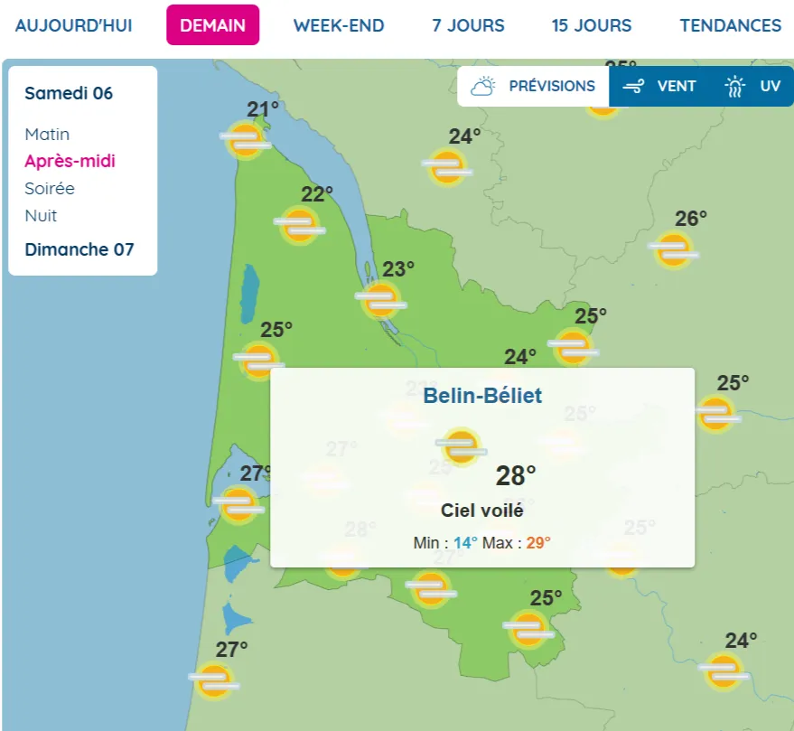 Il va faire chaud ce week-end, notamment dans le Sud-Ouest de la France avec un pic attendu demain! 27 degrés sont déjà attendus à Bordeaux cet après-midi, 28 à Belin-Beliet et 25 à Marmande. Une forte masse d'air provenant d'Afrique va augmenter les températures à des niveaux records pour ce début du mois d'avril, avant une baisse du mercure dès dimanche.