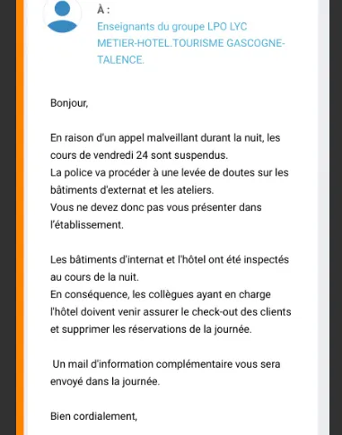 Et c'est reparti aujourd'hui. Nouvelles alertes à la bombe en Gironde. Seraient touchés ce matin le Lycée Jean Moulin de Langon, le lycée hôtelier de Gascogne à Talence et celui de Saint-Genès à Bordeaux-Talence ou encore le lycée Max Linder de Libourne. Plusieurs autres lycées bordelais seraient aussi visés ainsi que Arcachon, La Brède, La Réole et Saint-André de Cubzac. Parents et professeurs rapportent avoir reçu un mot de leur direction respective par e-mail ou par sms la nuit dernière ou tôt ce vendredi matin. Certains sites ont rouvert ce matin, d'autres sont fermés jusqu'à la mi-journée, voire jusqu'à ce soir.