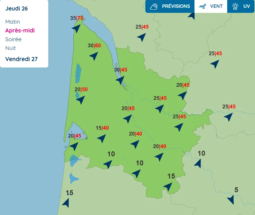 Attendez-vous aussi à des rafales, surtout sur la pointe du Médoc. Là aussi, la Gironde est en alerte jaune au risque de vent, entre 14h et 18h.