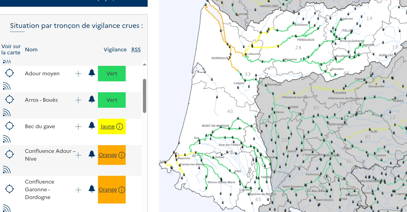 Le département de la Gironde est en alerte orange aux vagues-submersion et aux crues comme en attestent la carte de Météo France ci-dessus et celle du site Vigicrues ci-dessous.