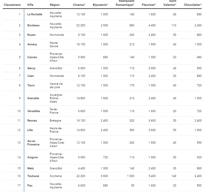 Sacrée ville la plus romantique de France en 2022 et en 2023, Bordeaux le ne sera pas en 2024 ! En effet, la capitale girondine a été détrônée par La Rochelle. Pour réaliser ce classement, Holidu.fr, a étudié les volumes de recherche sur Google dans les villes françaises de plus de 70 000 habitants avec des mots-clés en lien avec la Saint-Valentin (cinéma, bijouterie, fleuriste, chocolatier, restaurant romantique... suivis du nom de la ville). Et à ce petit jeu la commune portuaire de Nouvelle-Aquitaine, quatrième l'an passé, tire son épingle du jeu en dépassant sa voisine girondine.