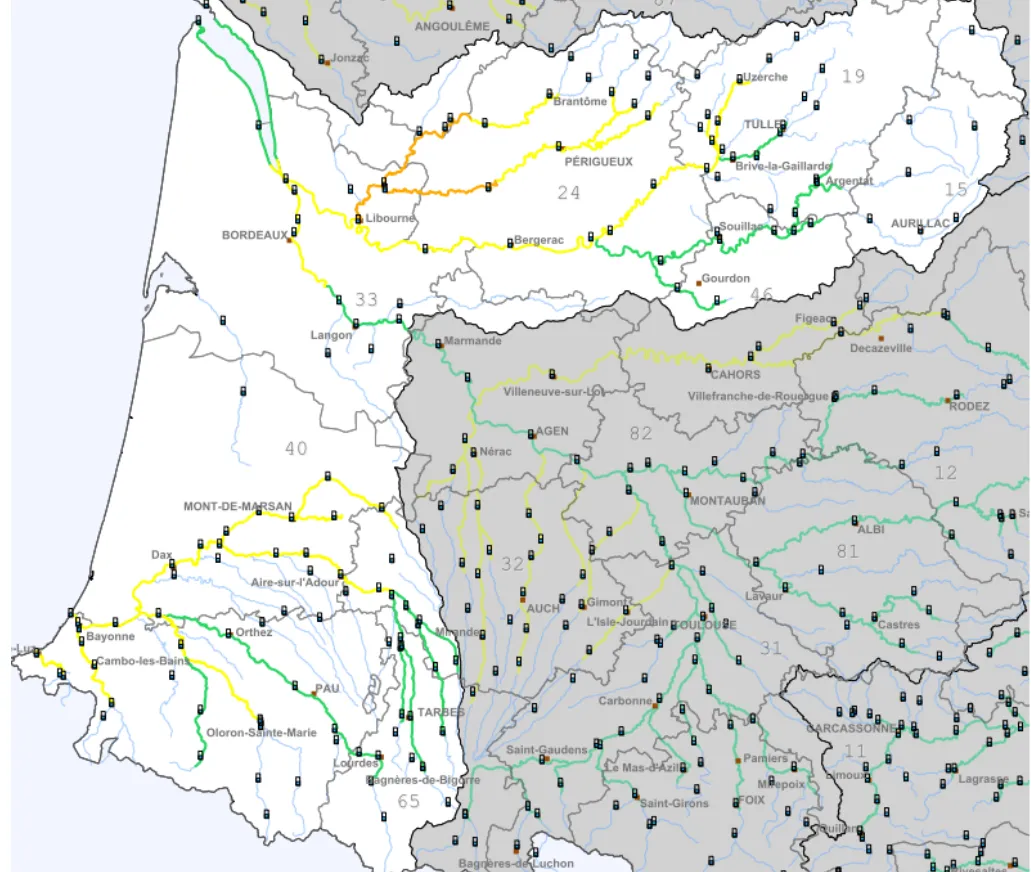 Selon Vigicrues, la vigilance se focalise sur le Lot moyen et le Lot en aval, puis sur plusieurs cours d'eau comme les tronçons Gélise-Baïse-Osse.