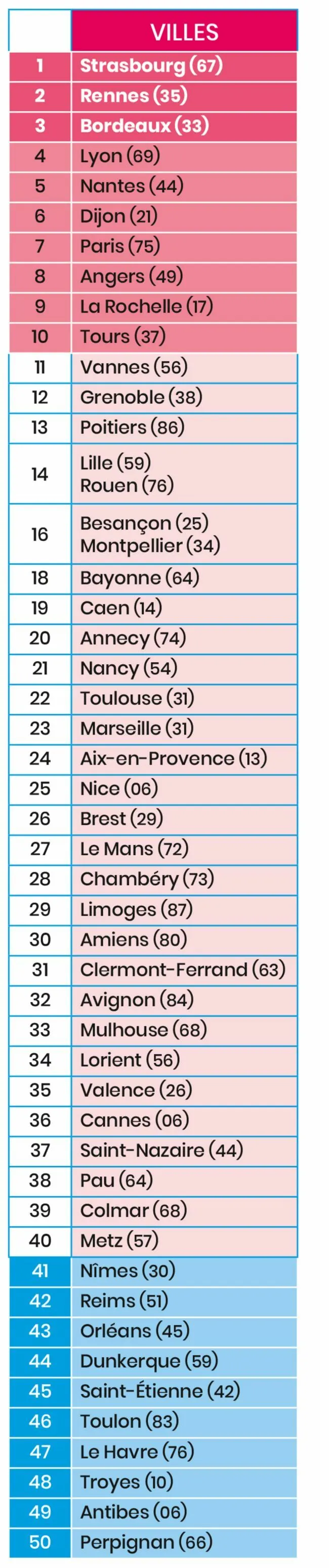 La Rochelle (9ème), Poitiers (13ème), Bayonne (18ème), Limoges (29ème) et Pau (38ème), sont les autres villes de Nouvelle-Aquitaine à apparaître dans ce top 50.
