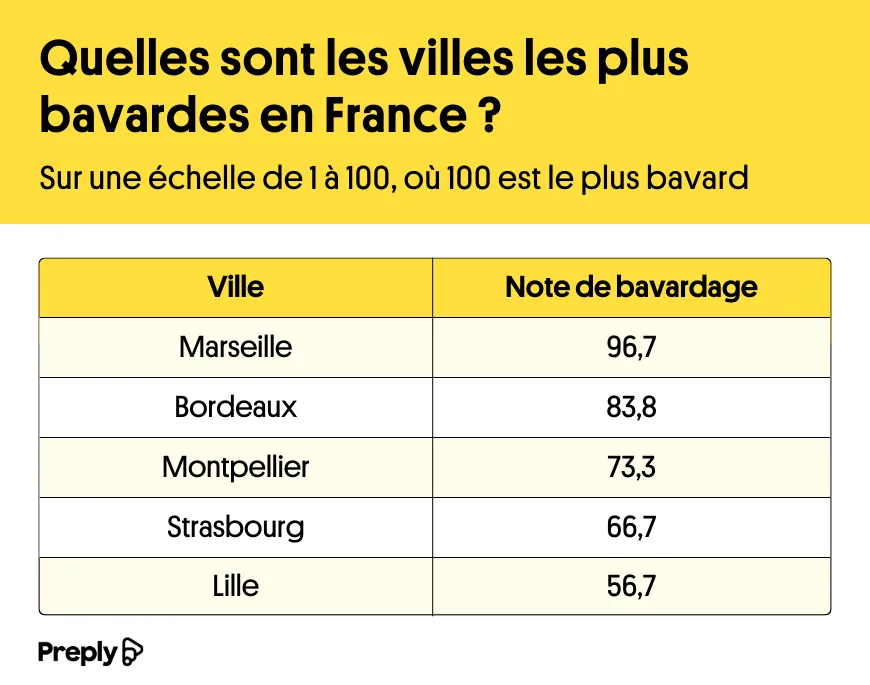 Parle t-on gavé à Bordeaux ? Apparemment oui ! C'est en tout cas ce que nous apprend une étude réalisée par Preply et publiée il y a peu. La plateforme d’apprentissage des langues a interrogé plus de 1500 français dans 15 villes de France sur la fréquence à laquelle ils utilisent une trentaine de comportements dans leur vie de tous les jours (remercier quelqu'un, saluer les collègues, bavarder dans la rue, parler aux commerçants...). Avec une note de bavardage de 83,8 sur 100, Bordeaux est ainsi la deuxième ville la plus bavarde du pays bien devant Montpellier (73,3) mais derrière Marseille (96,7). C'est tout le contraire pour Dijon (20), Rennes (23,3) et Reims (33,3) qui seraient les villes les moins loquaces de France.