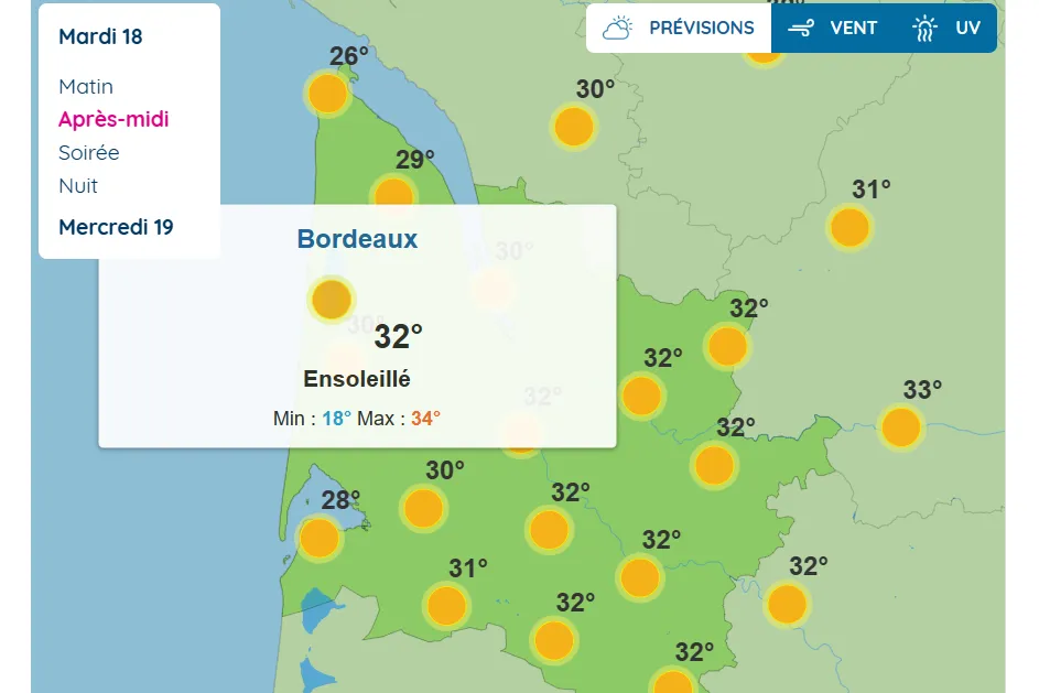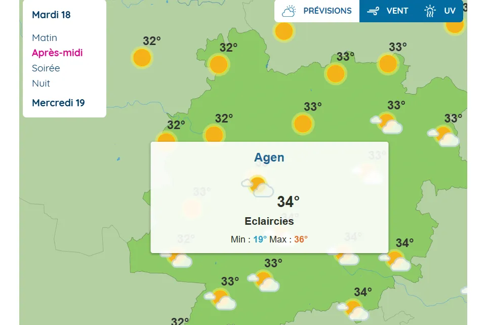 En ces temps estivaux, les fortes chaleurs s’installent cette semaine dans la région. Il devrait faire jusqu’à 36 °C cet après-midi chez nous, dans le Sud-Ouest, et 40 degrés dans le Sud-Est. En ce mardi matin, il fait déjà 22 degrés sur le littoral girondin, comme à Lacanau, et à l’intérieur des terres comme à Libourne et Marmande, 23 degrés à Ruch, 24 à Agen et même 25 à Monflanquin. Cet après-midi, il fera 34 degrés au maximum en Gironde selon Météo France et 36 en Lot-et-Garonne. Il faudra bien penser à fermer vos volets ce matin, à rester bien au frais dès la mi-journée, autant que possible, et surtout, boire de l’eau au maximum pour éviter toute déshydratation./t:r(unknown)/filters:format(webp)/radios/arl/pagesImages/iD2XkamVQO/YjD6bSsUYa.png)