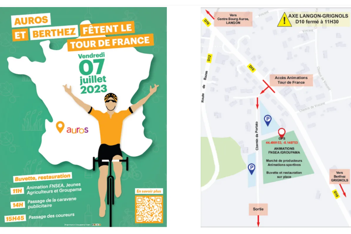 Les communes d'Auros et Berthez, en collaboration avec Groupama, la FNSEA33 et les Jeunes Agriculteurs de Gironde, organisent une Fan Zone ouverte au grand public pour célébrer le passage du Tour de France ce Vendredi 7 Juillet.