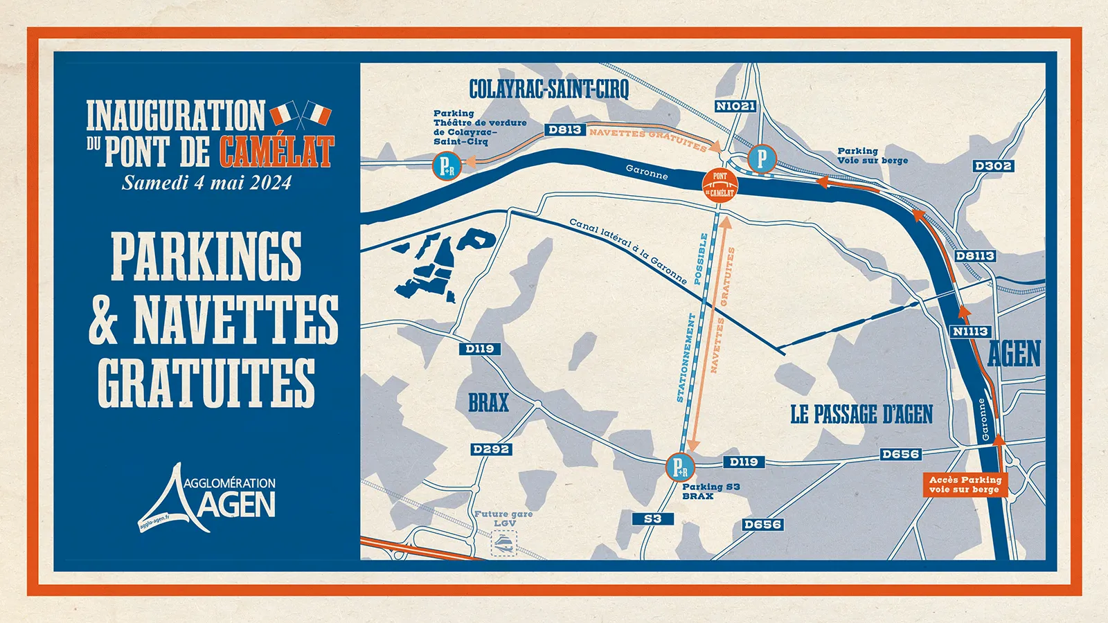 Notez la fermeture de la voie sur berge (N1113) du samedi 4 mai 2024 à partir de 13h00 jusqu'au dimanche 5 mai 2024 à 1h. Durant ce laps de temps, la voie sur berge est réservée au stationnement des participants de l'inauguration du Pont. L'accès et la sortie en véhicule de ce parking se fait en sens unique depuis le rond-point de Saint-Jacques vers le rond-point de Camélat.