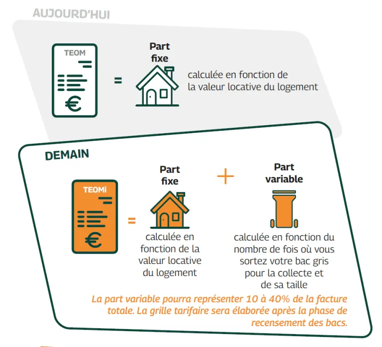 La taxe d'enlèvement des ordures ménagères apparaîtra toujours sur la taxe foncière : elle sera encore calculée sur la valeur locative mais comprendra une part variable calculée en fonction de la taille du bac gris et du nombre de fois où il sera sorti pour la collecte.