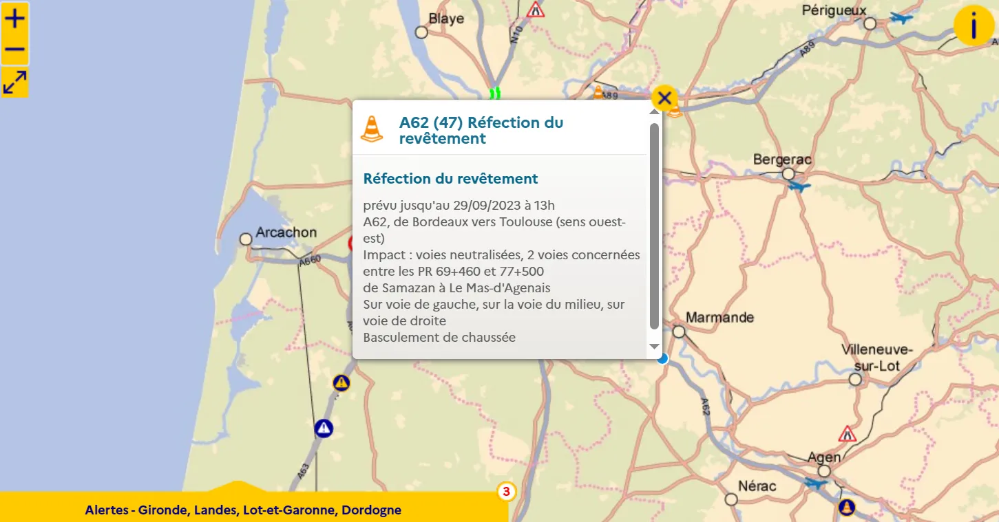 Vinci Autoroutes réalise en ce moment la rénovation des chaussées de l’autoroute A62 entre la sortie 4 de La Réole et la sortie 6 d'Aiguillon. A ce jour, les ouvriers sont en chantier à hauteur du Mas d'Agenais. Cette action occasionne la fermeture de l'aire de services entre aujourd'hui et vendredi dans le sens Bordeaux-Toulouse. La circulation est maintenue mais elle est basculée dans le sens opposé aux travaux.